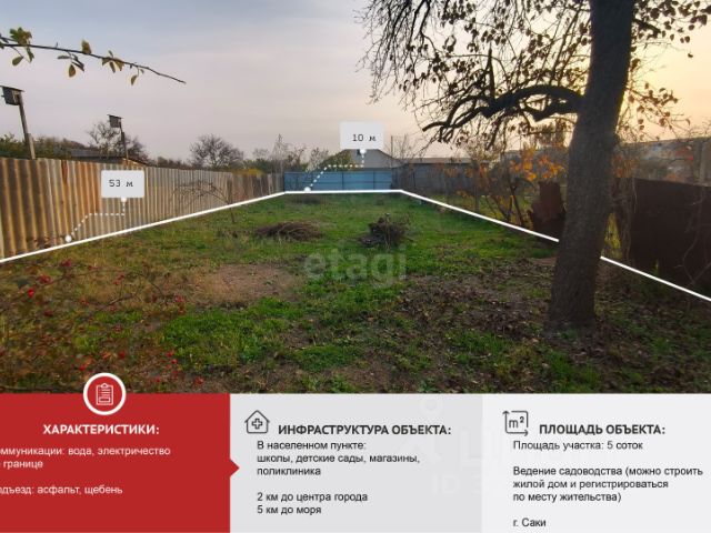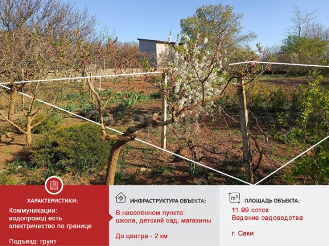 Продается земельный участок в курортном городе Саки! Участок площадью 6 соток располагается в новом массиве, в 4 км от просторных песчаных пляжей. До центра города 2 км. 1,5 км до прогулочной зоны города - Набережной сакского соленого озера. Участок на перспективу,под строительство жилого дома. Размеры участка (21 на 28 метров) позволяет разместить дом, гараж или навес, зону отдыха,мангальную зону. Участок угловой, что позволяет организовать входные зоны с двух сторон. В ближайшей перспективе планируется проведение коммуникаций в данный массив. Не упустите возможность приобрести участок недалеко от моря! Наша комиссия 79000 р.+1% от стоимости объекта, но не менее 70000 р. МЫ ГАРАНТИРУЕМ ФИНАНСОВУЮ БЕЗОПАСНОСТЬ ДЛЯ НАШИХ КЛИЕНТОВ. Полное юридическое сопровождение сделки. Высокий шанс одобрения ипотеки. Звоните, с удовольствием ответим на ваши вопросы! Код пользователя: 113474 Номер в базе: 6814065 Продается земля (СНТ) в Саки.