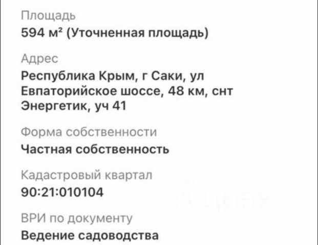 Продается земельный участок 2,5 сотки , город Саки , улица Заводская , СНТ Химик-1. Участок расположен в 2,5 километрах от моря , земли населённых пунктов , вид разрешенного использования-ведения садоводства . По улицам уже разведен водопровод ,электричество также проходит по улице. Есть возможность приобрести три участка рядом ,тогда площадь будет 6,5 соток. Район активно развивается,т.к. в пешей доступности море ,идет строительство набережной, к 2030 году сдача проекта "Золотые пески". В этом массиве есть участки и другой площади с более высокой ценой. Наша комиссия 59000 р.+1% от стоимости объекта, но не менее 70000 р. МЫ ГАРАНТИРУЕМ ФИНАНСОВУЮ БЕЗОПАСНОСТЬ ДЛЯ НАШИХ КЛИЕНТОВ. Полное юридическое сопровождение сделки. Высокий шанс одобрения ипотеки. Звоните, с удовольствием ответим на ваши вопросы! Код пользователя: 62009 Номер в базе: 9973910