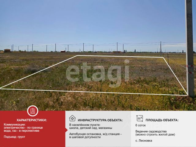 Продается участок 6 соток садоводство в с. Лесновка под строительство вашего частного дома. К участку подключено электричество, есть счетчик 380( 3 фазы ) 15 кВт. Получено ГПЗУ, участок ровный. В Лесновке есть прекрасная школа, футбольный клуб, церковь, административный центр. Прекрасная инвестиция в ваше будущее. 1 собственник, документы проверены, быстрый выход на сделку. Номер объекта: #1/550104/23345