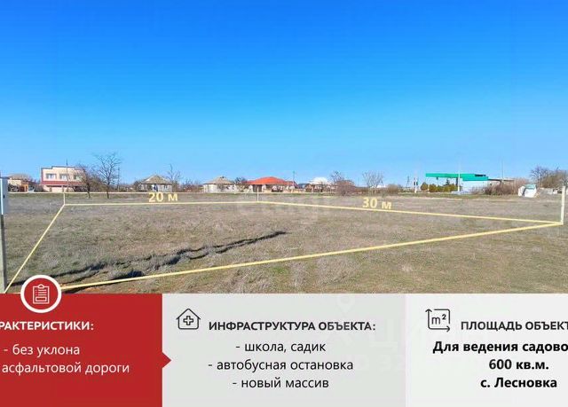 Продается земельный участок в новом районе села Лесновка, Сакский район, западный Крым! Площадь участка составляет 6 соток - есть место разместить все необходимые строения. В 100 метрах от участка находится остановка общественного транспорта. До железнодорожной платформы - 200 м. Это говорит о том, что быстрый доступ к морскому побережью и всем курортным зонам Крыма без пробок обеспечен. Участок расположен в близости к новой трассе Таврида. Вы сможете легко добраться в любую точку полуострова. В селе Лесновка есть все необходимое для комфортной жизни: школа, детский сад, амбулатория, библиотека, почта, дом культуры и продуктовые магазины. На автомобиле вы доберетесь до города Саки и известного лечебного соленого озера за 5 минут, а до моря и Розового озера — за 15 минут. Коммуникации: электричество заведено в массив, столб возле участка, газ, вода в процессе. Право собственности оформлено, участок готов к продаже. Звоните прямо сейчас, чтобы записаться на просмотр и узнать все подробности. Наша комиссия 79000 р.+1% от стоимости объекта, но не менее 70000 р. МЫ ГАРАНТИРУЕМ ФИНАНСОВУЮ БЕЗОПАСНОСТЬ ДЛЯ НАШИХ КЛИЕНТОВ. Полное юридическое сопровождение сделки. Высокий шанс одобрения ипотеки. Звоните, с удовольствием ответим на ваши вопросы! Код пользователя: 153392 Номер в базе: 7058844