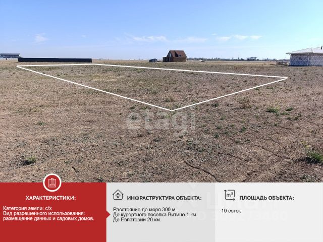 Продается участок 9 соток, под строительство в 1 километре от пляжа. Участок ровный, правильной формы, рядом с участком проходит линия электропередач и центральное водоснабжение. Возле участка идет активная застройка. Категория земли: Земли сельскохозяйственного назначения. ВРИ: Размещение дачных домов и садовых домов. В селе Витино отличные песчаные пляжи, что в свою очередь привлекает большое количество туристов. В селе есть магазины, кафе, регулярно ходит общественный транспорт. До города Евпатория 16 километров. Документы РФ, участок готов к продаже. МЫ ГАРАНТИРУЕМ ФИНАНСОВУЮ БЕЗОПАСНОСТЬ ДЛЯ НАШИХ КЛИЕНТОВ. Полное юридическое сопровождение сделки. Высокий шанс одобрения ипотеки. Звоните, с удовольствием ответим на ваши вопросы! Код пользователя: 99873 Номер в базе: 3247077