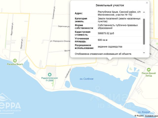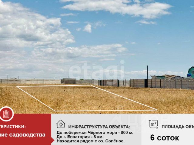 Продам участок СНТ 6 соток в 1200 метрах от пляжа, Сакский район, Молочненское сельское поселение, Крым. Участок прямоугольной формы 20 х 30 метров, находится в 2км от села Молочное, с развитой инфраструктурой, где есть школа, детский сад, больница и множество магазинов. Молочное — село на западе района, в степном Крыму, на северном берегу озера Солёное в 1,2 км от берега Чёрного моря, высота над уровнем моря — 5 м. До Евпатории 10 км. Участок находится в пределах земель населенного пункта, что гарантирует вам все преимущества городской инфраструктуры. Разрешенное использование - садоводство, что предусматривает строение домов до 3х этажей и введением в эксплуатацию как жилой, то есть с пропиской. Участок находится в непосредственной близости к озеру Соленое, до озера 150 метров. Озеро Солёное — это озеро-лиман с лечебными грязями. Они содержат множество полезных микроэлементов: железо, магний, калий, кальций. Применяются при лечении: кожные заболевания, заболевания, связанные с центральной и периферической нервной системами, нарушения в работе опорно-двигательного аппарата, ЛОР-заболевания и многие другие. Не упустите шанс как можно скорее стать владельцем этого участка! Подходит под все виды оплаты. Звоните прямо сейчас, и я с удовольствием отвечу на все ваши вопросы. Номер объекта: #1/537756/16929 Продается земля (СНТ) в селе Молочное Сакского района.