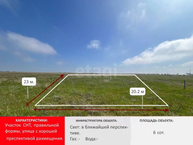 Арт. 100385805 К продаже представлен земельный участок, в непосредственной близости к береговой линии пгт Николаевка, Симферопольского р-на. Площадь участка составляет 6 соток, назначение (СНТ, ДНП), но в скором времени участки данного р-на переведут под ИЖС, участок ровный, правильной формы. Из коммуникаций, до конца 2025 года в микрорайоне проведут все необходимые коммуникации (свет, газ, вода). Поселок густонаселенный, социально развитый, школы, садики, рынки, магазины, парки, и самая главная жемчужина Крыма - это морское песочное побережье!!! Постоянное транспортное сообщение, есть свой автовокзал. Сделана новая дорога, и по этому за 25 - 30 минут, вы доедите на маршрутном такси или на личном авто до столицы Крыма, г. Симферополь. Не упустите свой шанс построить дом своей мечты возле морского побережья, звоните организуем оперативны и быстрый показ!