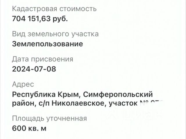 Продаётся уникальный участок, площадью 6 соток, близ живописного пгт. Николаевка, Симферопольского района! Это Ваше идеальное место для жизни и отдыха, где до моря всего 10 минут пешком. Представьте себе утренние прогулки по пляжу и вечерние встречи с друзьями на берегу всё это станет реальностью! Николаевка это не просто посёлок, а настоящая жемчужина, где жизнь кипит и радует разнообразием. Здесь Вы найдёте всё необходимое для комфортной жизни: школу, детский сад, амбулаторию и станцию скорой помощи. Множество магазинов, включая крупные сетевые супермаркеты, обеспечат Вас всем необходимым. Для активного отдыха и досуга в Вашем распоряжении рынки, дома культуры, уютные кафе, гостиницы, парки, детские и спортивные площадки, стадионы всё для Вашего удобства и наслаждения! Не упустите шанс стать владельцем этого замечательного участка, где природа и комфорт гармонично сочетаются. Создайте свой идеальный дом в окружении красоты и уюта, наслаждайтесь загородной жизнью и удивительными пейзажами! Звоните прямо сейчас, чтобы узнать все подробности и записаться на просмотр! Ваш новый дом ждет Вас! Код объекта: 8893754 МЫ ГАРАНТИРУЕМ ФИНАНСОВУЮ БЕЗОПАСНОСТЬ ДЛЯ НАШИХ КЛИЕНТОВ. Полное юридическое сопровождение сделки. Высокий шанс одобрения ипотеки. Звоните, с удовольствием ответим на ваши вопросы! Код пользователя: 152940 Номер в базе: 8893754