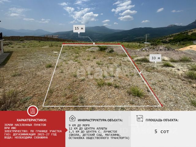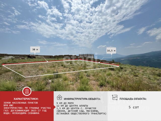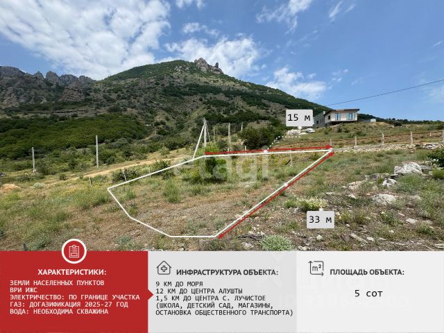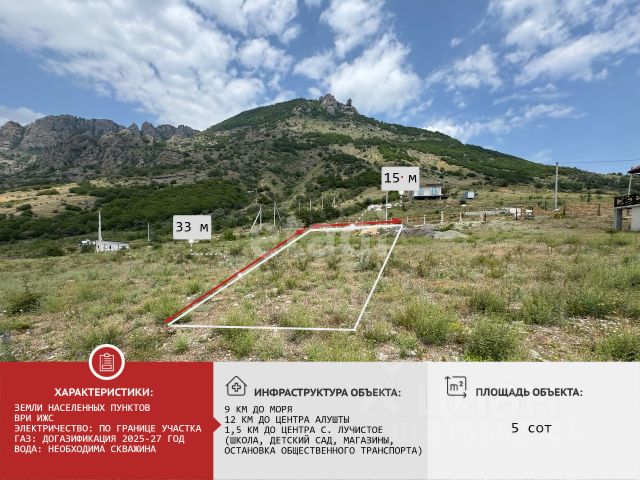 В продаже видовой (360 градусов вид на горы, Алушту) земельный участок в экологичном месте. Площадь земельного участка 5 соток. Участок расположен в п. Лучистое, в ближайших окрестностях города-курорта Алушта. Отличная локация для строительства жилого дома и постоянного проживания. Удобный подъезд прямо к участку.