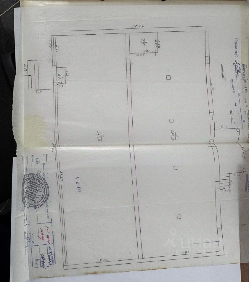 Фасад 30м. Два помещения (270 и 290м2) соединены проходом шириной 2м.