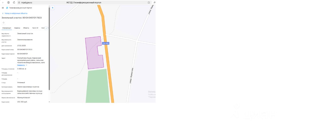 земельный участок, кадастровый номер 90:04:040101:7833, площадью 5000 кв. м., расположенный по адресу: Республика Крым, Кировский муниципальный район, сельское поселение Владиславовка, село Владиславовка; категория земель "земли населенных пунктов", вид разрешенного использования: выращивание зерновых и иных сельскохозяйственных культур