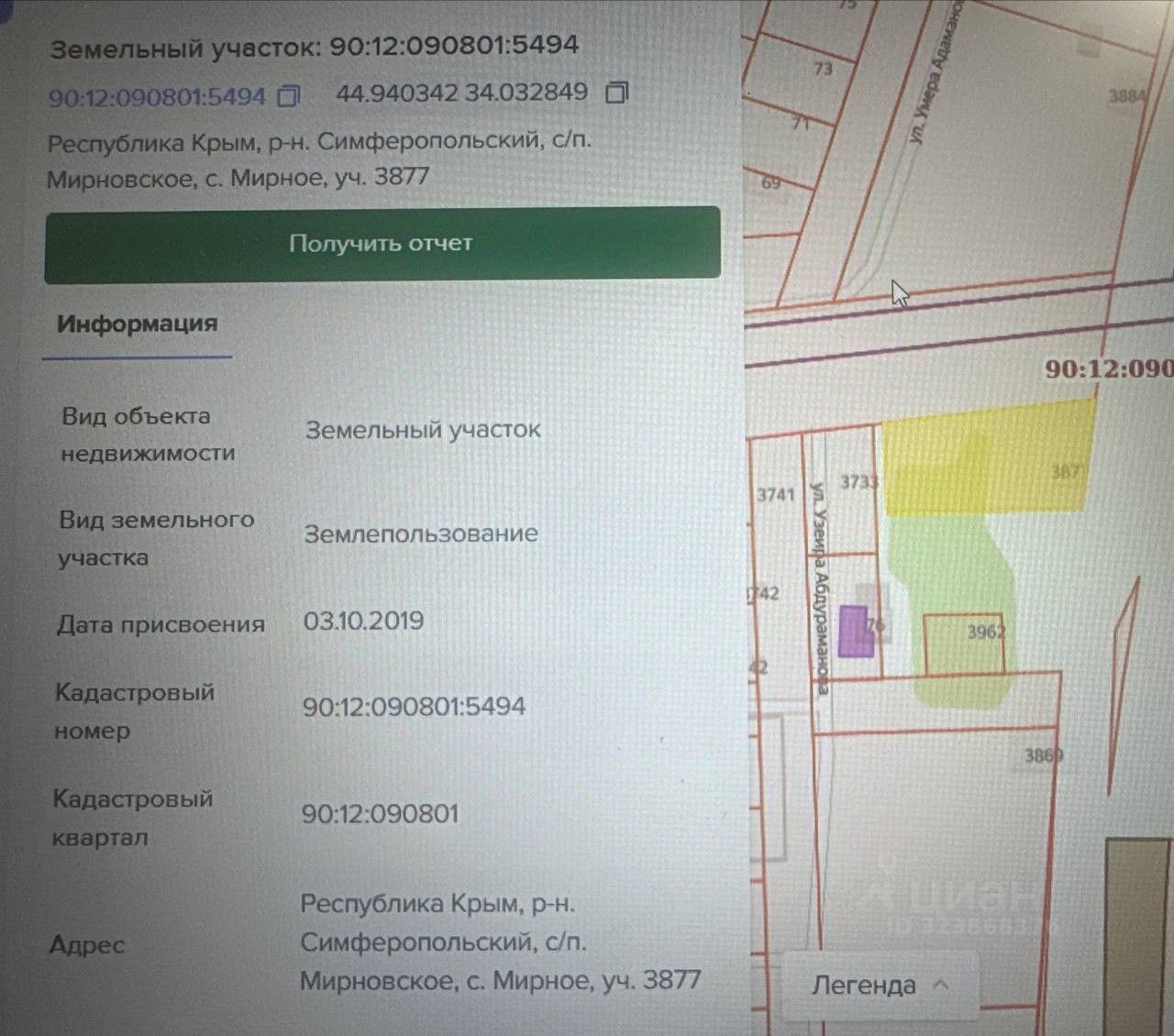 Земельный участок с кадастровым номером 90:12:090801:5494 площадь 1632 по адресу Республика Крым, р-н. Симферопольский, с/п. Мирновское, с. Мирное, уч. 3877