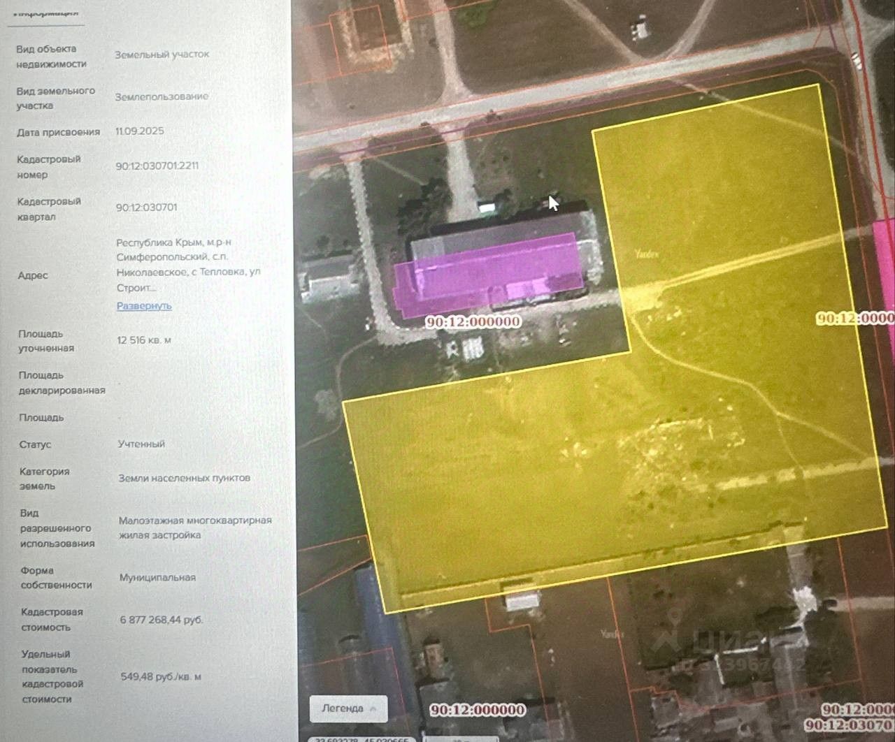 Земельный участок с кадастровым номером 90:12:030701:2211 площадь 12516 по адресу Республика Крым, м.р-н Симферопольский, с.п. Николаевское, с Тепловка, ул Строителей, земельный участок 43б