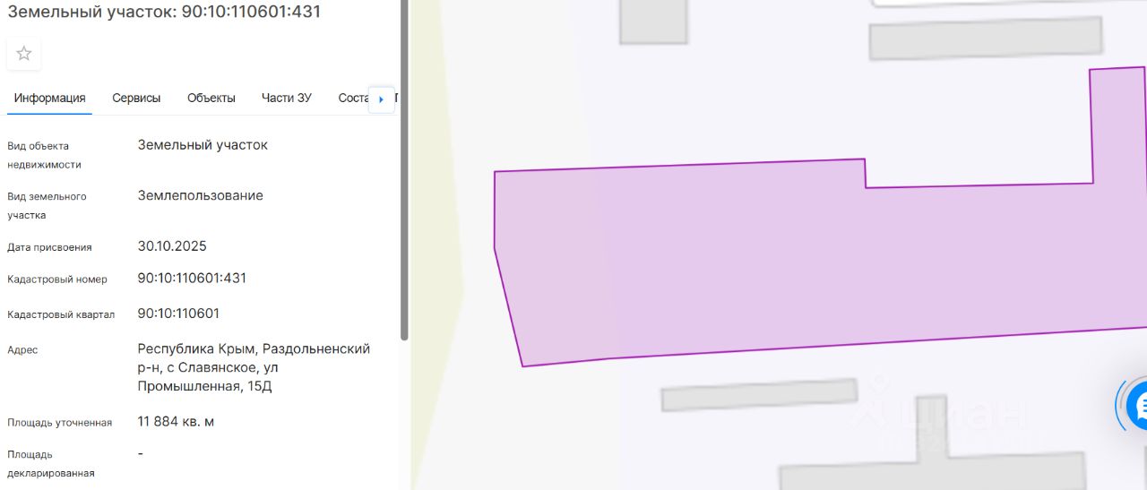 земельный участок с кадастровым номером 90:10:110601:431, расположенный по адресу: Республика Крым, Раздольненский район, с. Славянское, ул.Промышленная,15Д; площадью 11884 кв.м., категория земель: земли населенных пунктов; вид разрешённого использования: хранение и переработка сельскохозяйственной продукции, обеспечение сельскохозяйственного производства