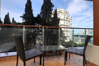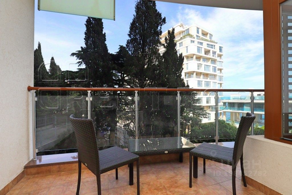 Просторный балкон оборудован летней мебелью. С балкона открывается частичный вид на море и Приморский парк.