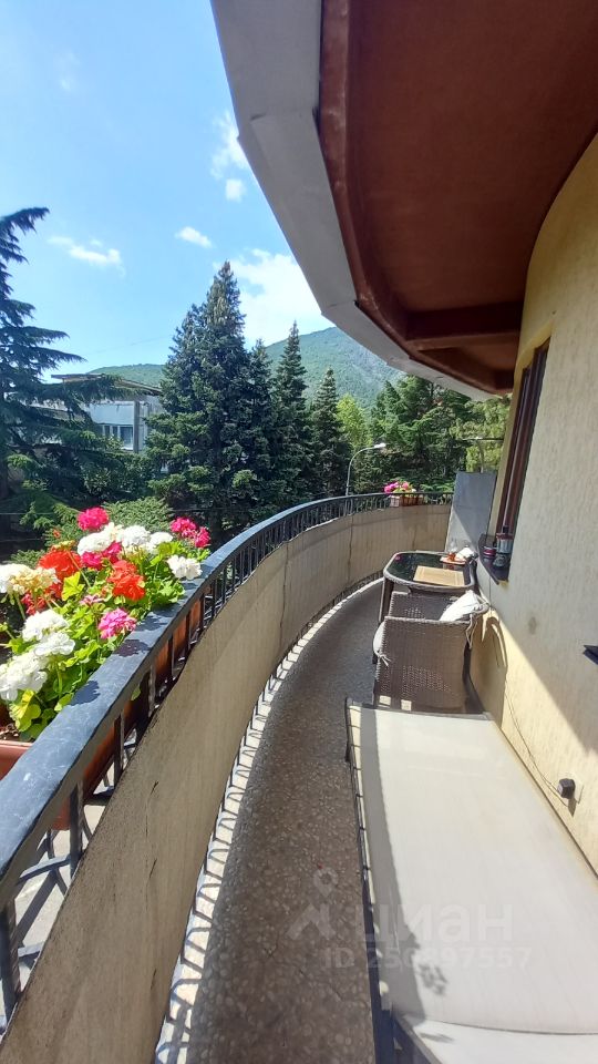Окна и балкон-терраса (авторское решение архитектора - 20 метров длиной) выходят на море, парк санатория Крым и подножие Медведь-горы (АЮ-ДАГ).