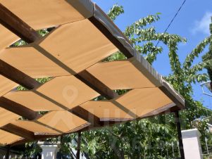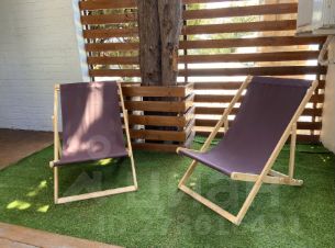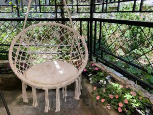 * Во дворике тканевый навес, подвесные качели, шезлонги, садовый стол и стулья.