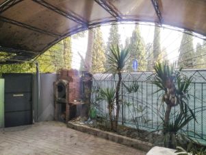 Во дворе летняя кухня с плитой и раковиной, много зелени