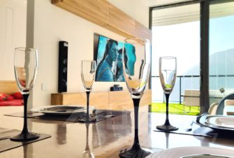 • стандартный набор: микроволновка, мультиварка и блендер (по запросу), тостер, система кондиционирования, чайник, фен, утюг, вертикальный пылесос