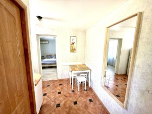 Номер 3-х местный (2 взрослых +1 ребенок) площадью 17 кв.м., без балкона, рядом расположена просторная беседка, кухня оборудована необходимыми принадлежностями.