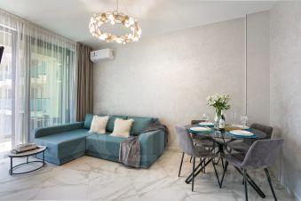 Одна изолированная спальня и открытый зал, балкон в сторону моря, просторная кухня и ванная комната. Квартира рассчитана на 4х гостей (кровать в спальне и двуспальный диван в зале).