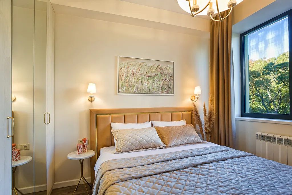 - Отдельная спальня с широкой двухместной кроватью и ортопедическим матрасом;