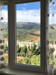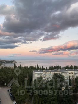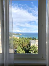 Видовая двух комнатная квартира в двух минутах пешком от проходной парка санатория Айвазовского . Кухня студия с Окном 1м80см на 5м, с панорамным видом на море, мыс Плака и прибрежные скалы.
