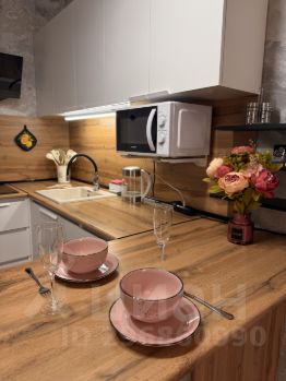 —Установлена полноценная кухня с большой рабочей поверхностью, барной стойкой, вытяжкой, плитой, микроволновой печью, чайником с регулировкой температуры и подсветкой, набором для приготовления еды и комплектом посуды.