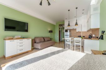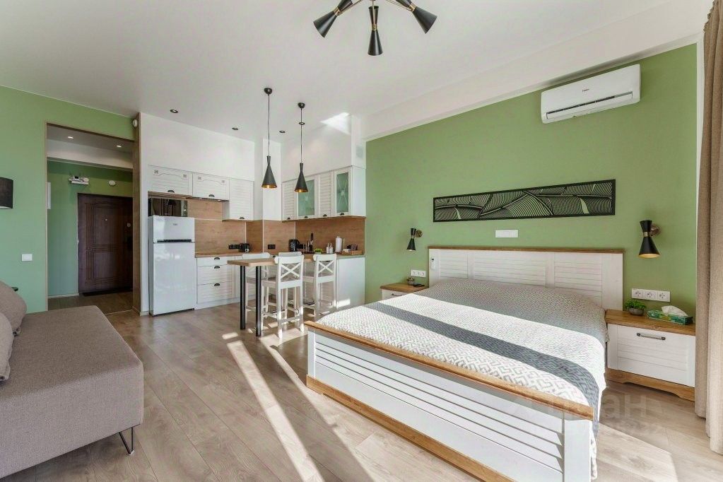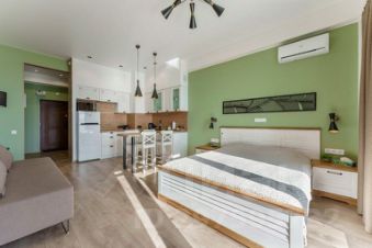 Квартира оснащена кухонным гарнитуром, обеденной зоной, посудомоечной машиной, двуспальной кроватью, раскладным диваном, шкафом для одежды, холодильником, встроенной электроплитой, вытяжкой, СВЧ печью с функцией духовки, блендером, кофемолкой, тостером, миксером, мультиваркой, СМАРТ ТВ с диагональю 55", стиральной машиной, чайником, феном, колонкой Алиса, кондиционером, постельным бельём, одноразовыми тапочками и полотенцами. Доступен безлимитный скоростной Wi-Fi.