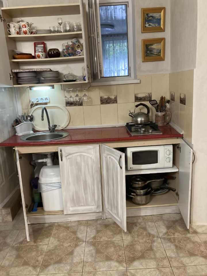 с микроволновой и газовой печью, холодильником, всей необходимой посудой, вода холодная и горячая постоянно. На территории под навесом обеденный столик с мягкими диванчиками, мангальная зона, тандыр, шахматный столик.