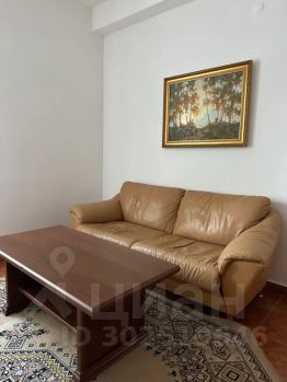 Гостиная: диван, два кресла, стол, телевизор, кабельное телевидение, Яндекс Станция Алиса.