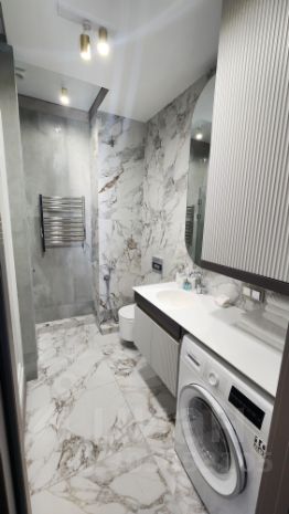 Полноценная кухня оснащена СВЧ, духовым шкафом, варочной поверхностью, чайником и кофемашиной, фильтром для воды, посудомоечной машиной