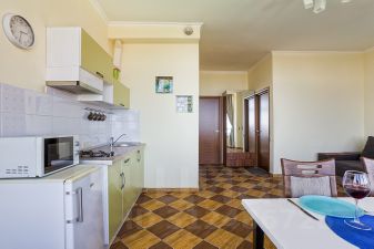 Апартаменты просторные, солнечные, с панорамными окнами. Есть полноценная кухня с бытовой техникой (плита, холодильник, микроволновая печь, вытяжка) и полный комплект посуды и постельных