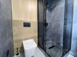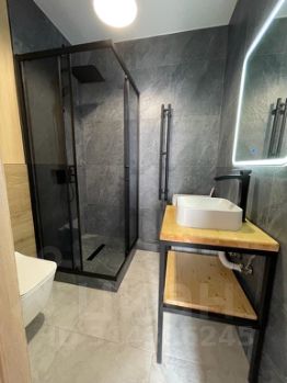Ванная комната с душевой кабиной и средствами личной гигиены.