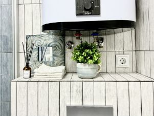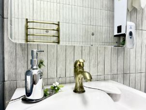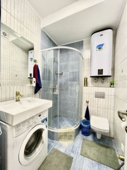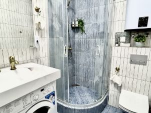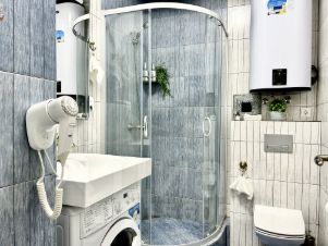 Современные удобства: В вашем распоряжении полностью оборудованный санузел с душевой кабиной и стиральной машиной автомат для вашего удобства.