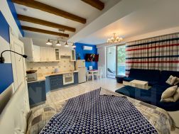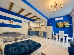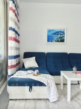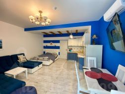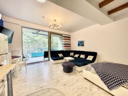 Простор и комфорт: Светлая и просторная студия разделена на функциональные зоны: уютная столово-кухонная зона, где вы сможете приготовить любимые блюда, и комфортная зона отдыха с мягким диваном и современным плазменным телевизором.