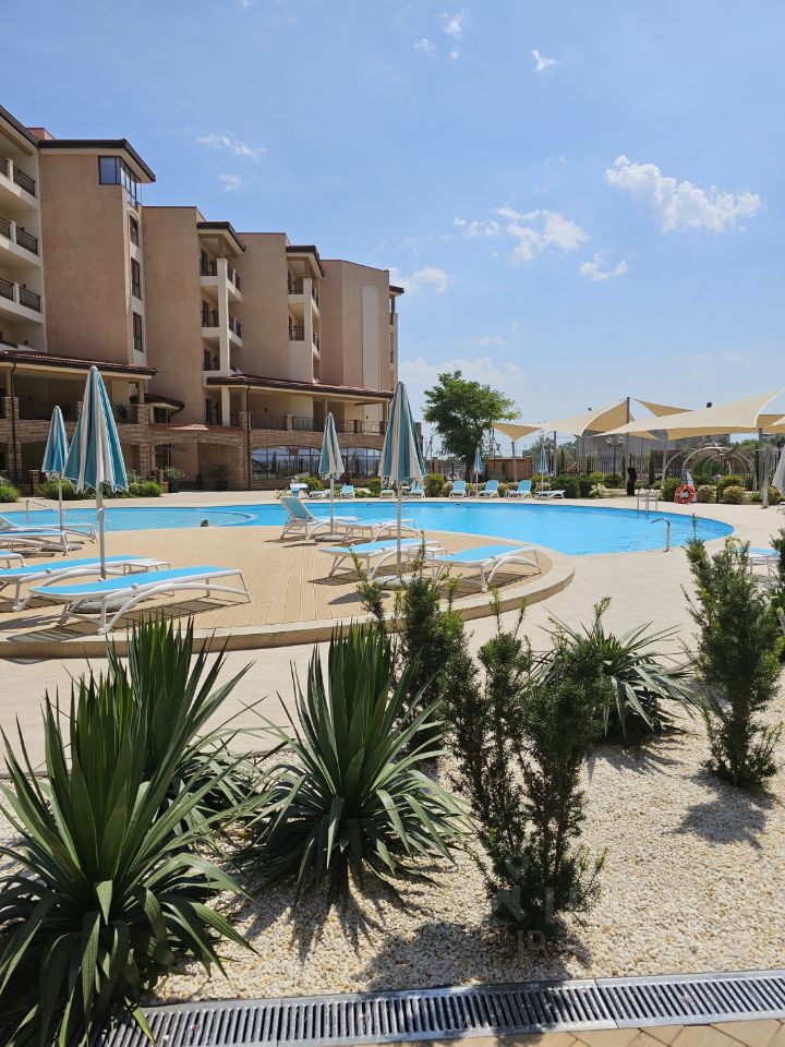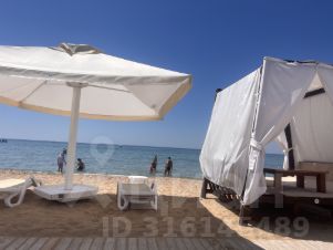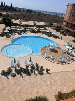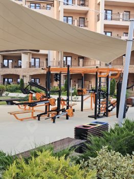 - терраса (выход из кухни-гостинной) мебель - два кресла, диван, два столика. Пол террасы облицован натуральным камнем - травертин. С террасы открывается вид на море, бассейн и детскую площадку. Предоставляется постельное белье, полотенца для пользования в апартаментах.
