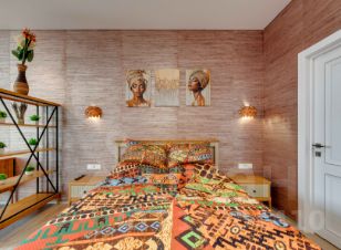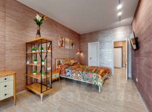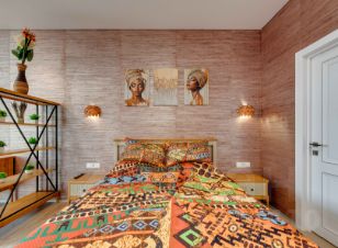 - Авторский интерьер в этническом стиле с использованием натуральных материалов: сосна, ясень, джутовые и тростниковые обои. Никакого ЛДСП!