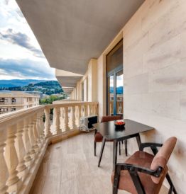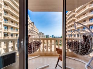 - Балкон 9 м² с подвесным креслом, столом и мягкими стульями — идеально для завтраков на рассвете и романтических вечеров.