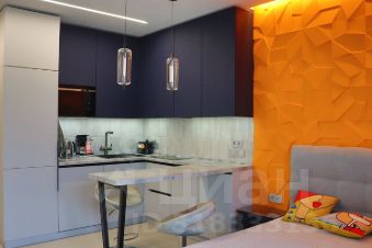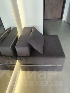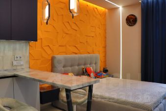 Мебель: двухспальная кровать, шкаф, кухонный гарнитур, обеденная зона (столешница), барные стулья, пуфик
