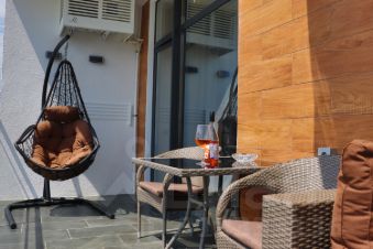 Прекрасный балкон с видом на море/горы. Балкон полностью оборудован для Вашего идеального отдыха. Мебель из искусственного ротанга. Балкон 12 метров. Стол, стулья, качели, диваны.