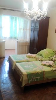 В спальном и зеленом районе, рядом есть два супермаркета, детская площадка.