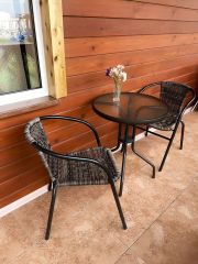 Санузел, ЖК телевизор, двуспальные (две односпальные) кровати с ортопедическими матрасами, постельное белье из страйп сатина, большой раскладной диван, кондиционер, холодильник, шкаф, две прикроватные тумбы, журнальный столик на колесах, возле номера зона отдыха, терраса.