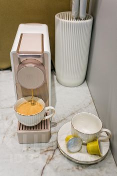 Бытовая техника: стиральная машина, духовка, электро плита, электрочайник, кофеварка, бокалы, кружки, чай - кофе, полная комплектация) и столовые приборы.