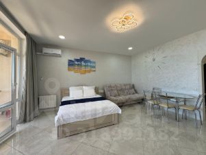 Апартаменты состоят из комнаты 26м², кухни и большой лоджии 12,5м² с видом на море. Апартаменты оборудованы полноценной кухней с необходимой бытовой техникой: индукционная варочная поверхность, вытяжка, СВЧ, эл. чайник. Установлена многофункциональная мойка и 3 ступенчатый автоматический фильтр холодной воды (не надо приобретать питьевую воду). Апартаменты оборудованы кондиционером, имеется смарт ТВ 55 дюйма. Апартаменты укомплектованы необходимой мебелью, постельными принадлежностями, полотенцами, столовой утварью и столовыми приборами.