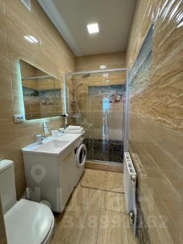 В ванной комнате просторная душевая кабина, раковина с тумбой для принадлежностей, столик для принадлежностей, фен, стиральная машина, большое зеркало с подсветкой. Есть утюг, гладильная доска, сушилка для одежды.