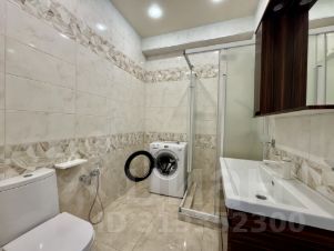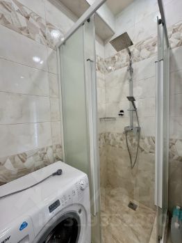 Совмещённый санузел с душевой кабиной и стиральной машиной.