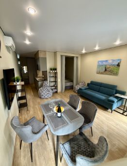 Всего сдаются 3 (три апартамента) радом друг с другом, объединенные общим балконом, что дает возможность размещения с друзьями, родственниками и пр. Балкон каждого номера отделяется передвижными кадками с цветами.