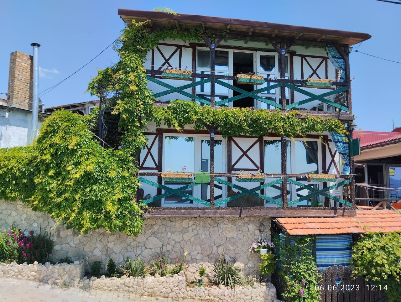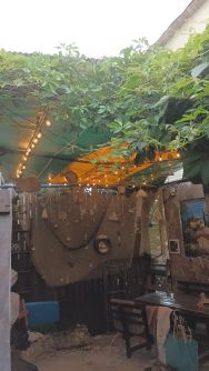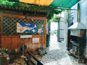 -1 этаж, деревянный навес около входа, столик, скамейка.
