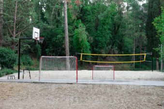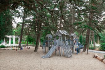 Территория санатория с прогулочными дорожками и детской площадкой в окружении реликтовых деревьев, спортивной площадкой с турниками и настольным теннисом;