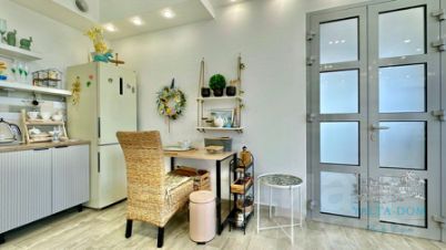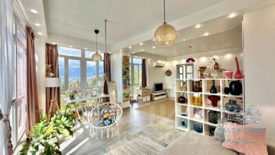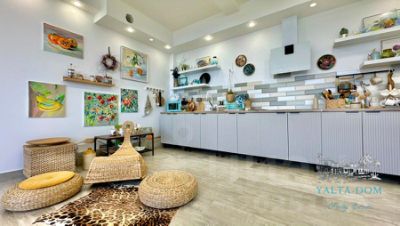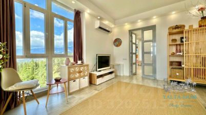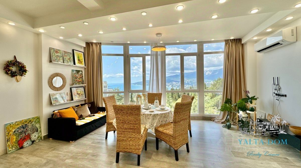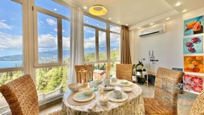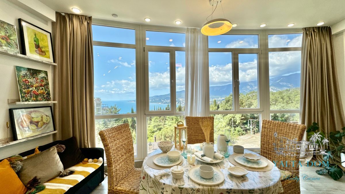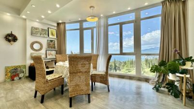 Квартира с прекрасным видом на море и горы, общей площадью 130 квадратных метров, расположена на третьем этаже нового жилищного комплекса, в пригороде Ялты, пгт. Восход. Выполнен дизайнерский ремонт, панорамное остекление, есть вся необходимая бытовая техника, мебель и посуда, кондиционеры, индивидуальное отопление.