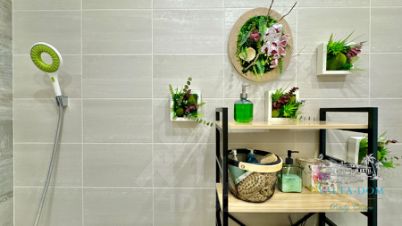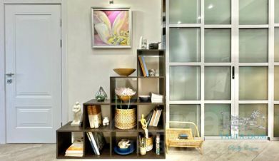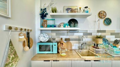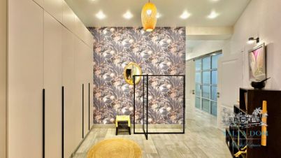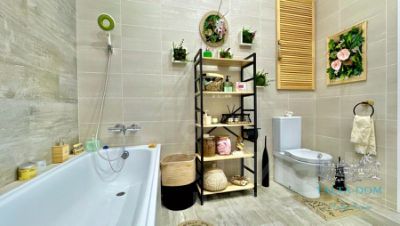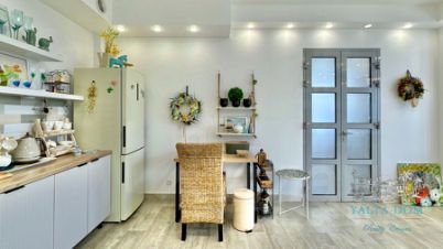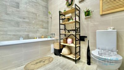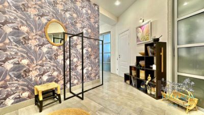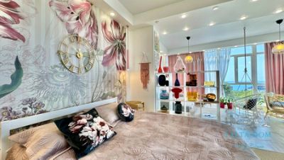 Квартира состоит из зоны прихожей с большим гардеробным шкафом, кухни-гостиной, двух санузлов, большого пространства, разделенного на спальню и зону отдыха.