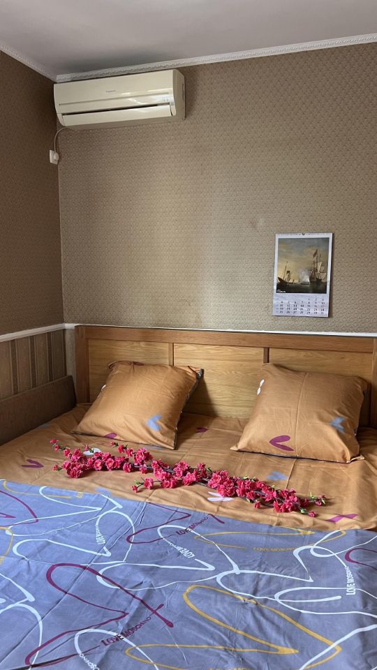 В комнате двухспальная кровать, раскладной диван, пуфик, письменный стол, журнальный столик. Большой шкаф, комод. Телевизор, кондиционер.