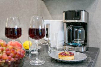 Бытовая техника: стиральная машина, духовка, электро плита, электрочайник, кофеварка, бокалы, кружки, чай - кофе, полная комплектация) и столовые приборы.